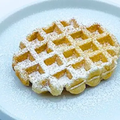 Morbido waffle cotto al momento su piastra decorato con zucchero a velo *trattamento di bonifica preventiva tramite abbattimento
