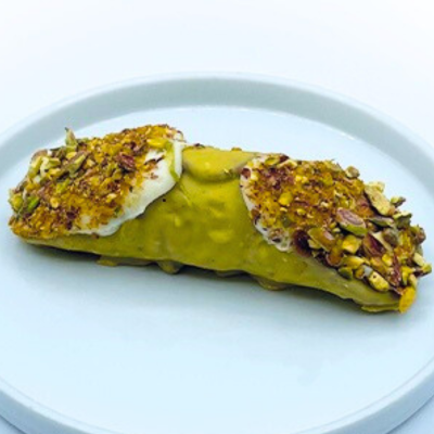 Fragrante cialda artigianale ricoperta da un velo di pistacchio siciliano croccante, farcito con ricotta di pecora, cuore morbido al pistacchio siciliano e granellone di pistacchi siciliani