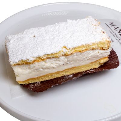 Croccante sfogliatura, ripiena con crema di ricotta al semolino e arancia, come da tradizione napoletana . *trattamento di bonifica preventiva tramite abbattimento